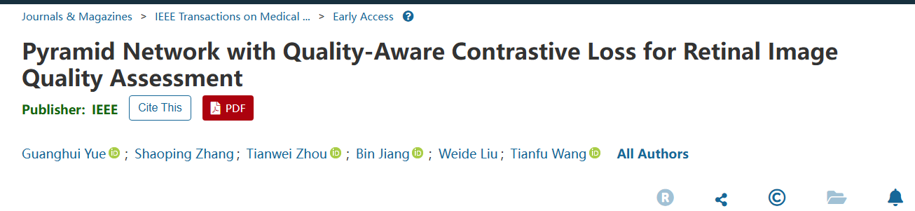 Careers近日,深圳大学医学部岳广辉副教授在医学图像处理领域顶级期刊IEEE Transactions on Medical Imaging (TOP期刊, 中科院一区,IF=8.9)上发表题为“Pyramid Network with Quality-Aware Contrastive Loss for Retinal Image Quality Assessment”的学术论文。青年教师岳广辉副教授担任第一作者,研究生张绍萍为第二作者。深圳大学为第一作者单位和通讯单位。