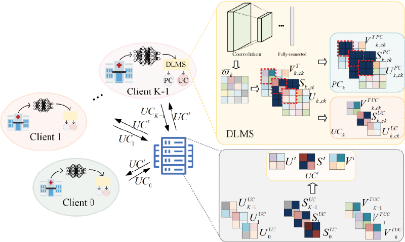 客户端采用解耦本地模型策略(DLMS),将本地模型分为通用组件(UC)和个性化组件(PC),其中UC包含与医学图像分类相关的通用信息,PC则包括适应于特定数据集的个性化信息;