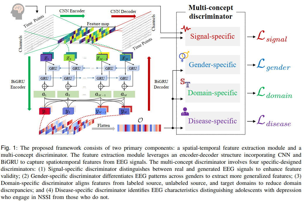 该研究针对儿童青少年情绪障碍的脑电表现,提出了一种基于高维EEG数据的多概念对抗生成网络NSSI-Net,融合信号、性别、领域和疾病四个判别器,分别用于提升脑电信号生成的真实性,减弱性别差异造成的特征偏移,实现跨个体和跨数据集的特征对齐,以及区分有无非自杀性自伤行为的抑郁青少年。