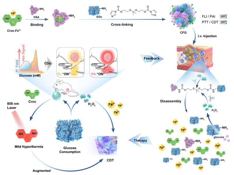 动态伴随指导温和光热增强CDT: 基于CFG的H⁺激活光热效应,通过建立FL/PA信号与温度的精准关联,可动态捕捉最佳激光照射时间窗,在最大化增效CDT的同时规避热损伤副作用,展现“伴随诊断-治疗优化”一体化设计优势。