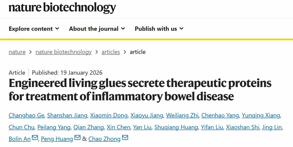 Careers近日,深圳大学医学部生物医学工程学院黄鹏教授团队与中国科学院深圳先进技术研究院钟超研究员团队合作,在合成生物学与生物医学工程国际顶级期刊Nature Biotechnology(影响因子41.7,中国科学院一区,TOP期刊)上发表了题为“Engineered living glues secrete therapeutic proteins for treatment of inflammatory bowel disease”的研究论文。