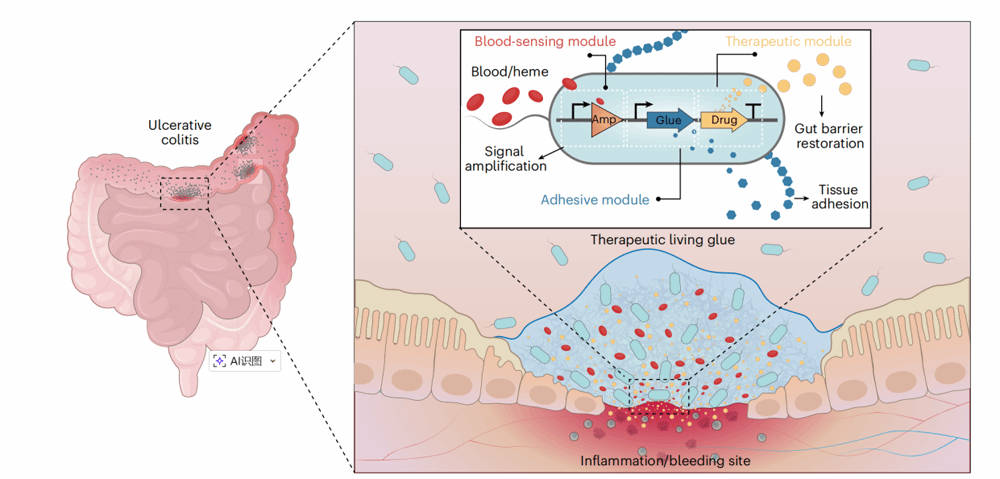 炎症性肠病(IBD)患者肠黏膜易发生反复损伤与出血,而现有医用粘合剂难以在湿润且持续蠕动的肠道内实现稳定黏附和精准修复。针对这一临床瓶颈,本研究创新开发出一种具备“信号感知—原位黏附—同步修复”功能的智能活胶水系统(TL-glue)。该系统以工程化大肠杆菌为载体,整合了高灵敏血液感应、动态生物黏附和同步修复治疗三大协同模块,从而赋予材料对病灶微环境的自主识别与响应能力。当TL-glue感知到病灶部位释放的微量出血信号时,可迅速激活内部基因回路,驱动海洋藤壶来源的黏附蛋白表达与分泌,在出血处原位自组装形成牢固的生物密封层,并同步持续释放黏膜修复肽TFF3,实现从识别、定位到治疗的一体化精准干预。在动物模型验证中,TL-glue在硫酸葡聚糖钠盐诱导的小鼠急性结肠炎模型及白介素10基因缺陷型小鼠自发性慢性结肠炎模型中均展现出显著治疗效果,能够有效促进肠黏膜屏障结构恢复、降低炎症因子水平、减少出血相关信号,并在口服肠溶递送体系中表现出良好的生物安全性与病灶靶向激活特性。